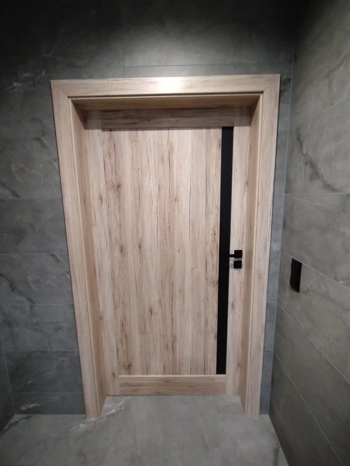 W tym wypadku klient zdecydował się skorzystać z wersji z szybą choć w tym modelu występuje także wersja pełna drzwi wewnętrznych. Zawsze atutem takiego rozwiązania jest fakt, że użycie szyby sprawia, że do wnętrz pomieszczenia dostaje się światło z zewnątrz (korytarza, przedpokoju).